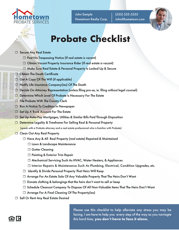 This is a checklist of some of the most common steps required when working though a probate case. While you should always consult an attorney to verify local and state laws and proceedings, this guide is an incredible resource to keep on hand.